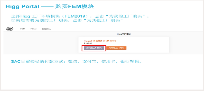 完成付款并得到確認后,可進入自界面開始填寫;HIGG FEM自評模塊一共分為8個方面: